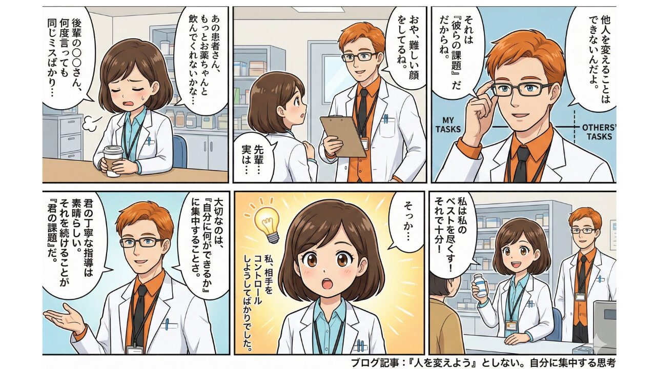 薬局長は、それまでの指導スタイルを見直し、「指示」から「相談・共有」に切り替えました。また、「何をどう伝えると相手が反発しにくいか」という視点で自分の言葉を選ぶようにしました。すると、不思議なことに徐々にそのスタッフとの関係が改善し、薬局全体の雰囲気も柔らかくなっていったのです。