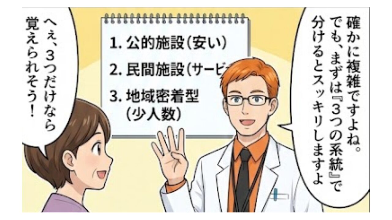 | 民間施設 | 介護付き有料老人ホーム/住宅型有料老人ホーム/サービス付き高齢者向け住宅(サ高住) | サービス内容や費用に幅がある。 |