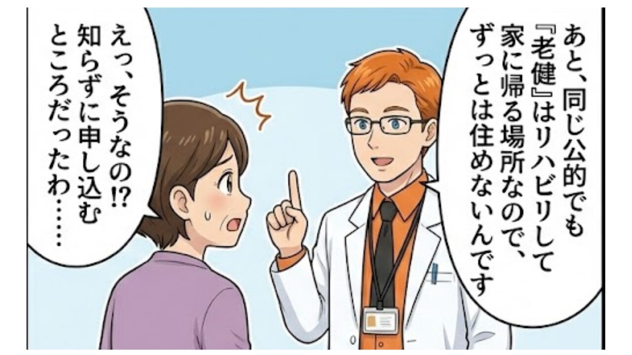 「老健」は、在宅復帰を目的とするリハビリ中心の施設です。医師や理学療法士が常勤しており、病院退院後の生活訓練の場として使われます。