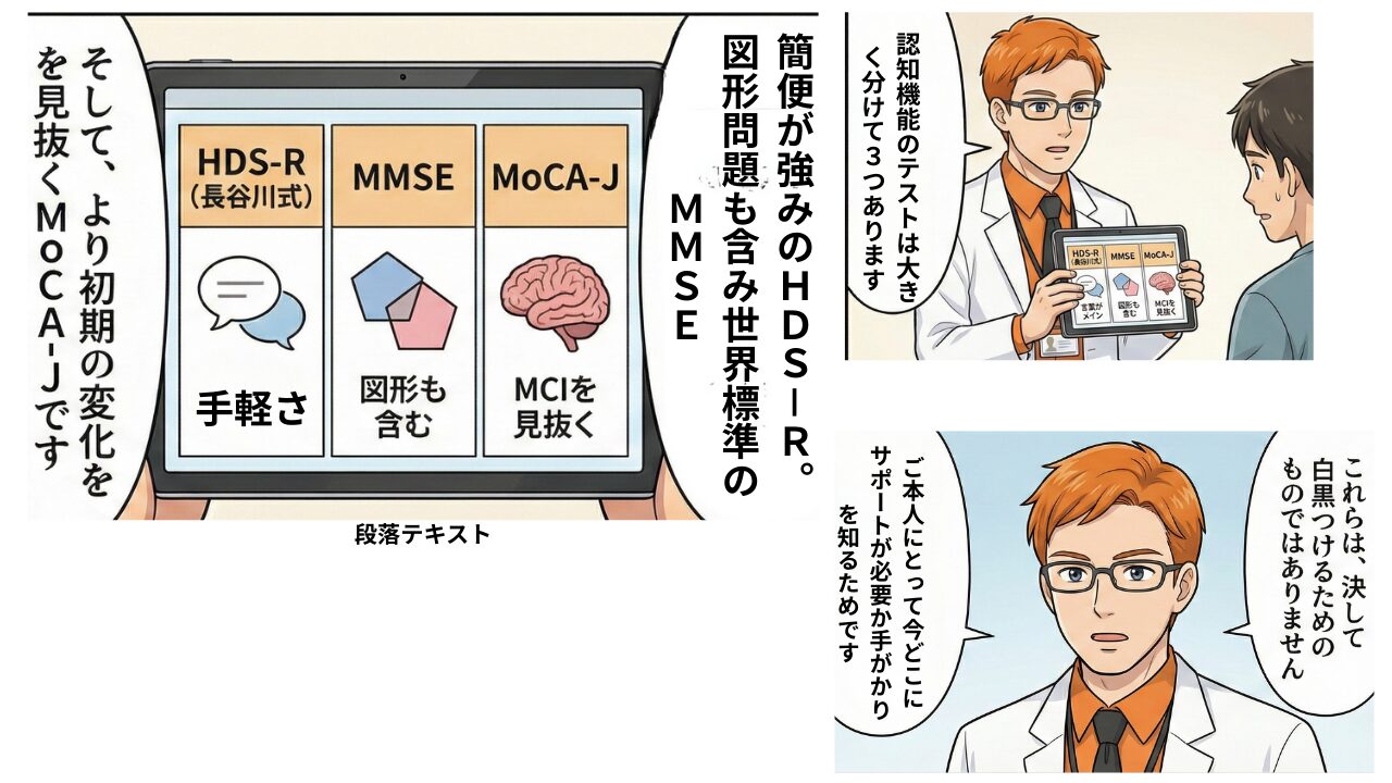 - 検査内容:時間や場所の見当識、即時記憶、計算、言語、構成能力などを含む30点満点のテスト