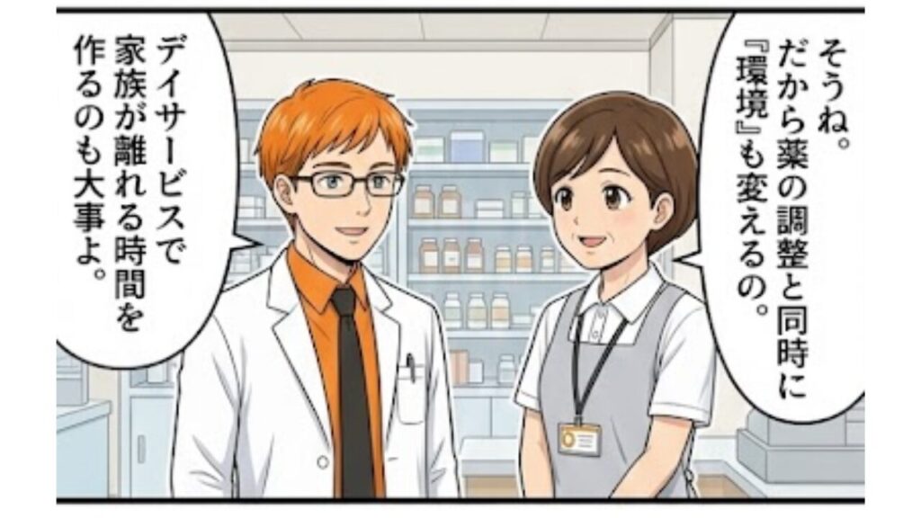 - 減薬の提案: 以前は暴れていたから飲んでいた薬が、今は過度な眠気を招き、誤嚥(ごえん)の原因になっていることも。「最近、日中ずっと寝ているな」と感じたら、薬剤師にご相談ください。処方を見直すタイミングかもしれません。