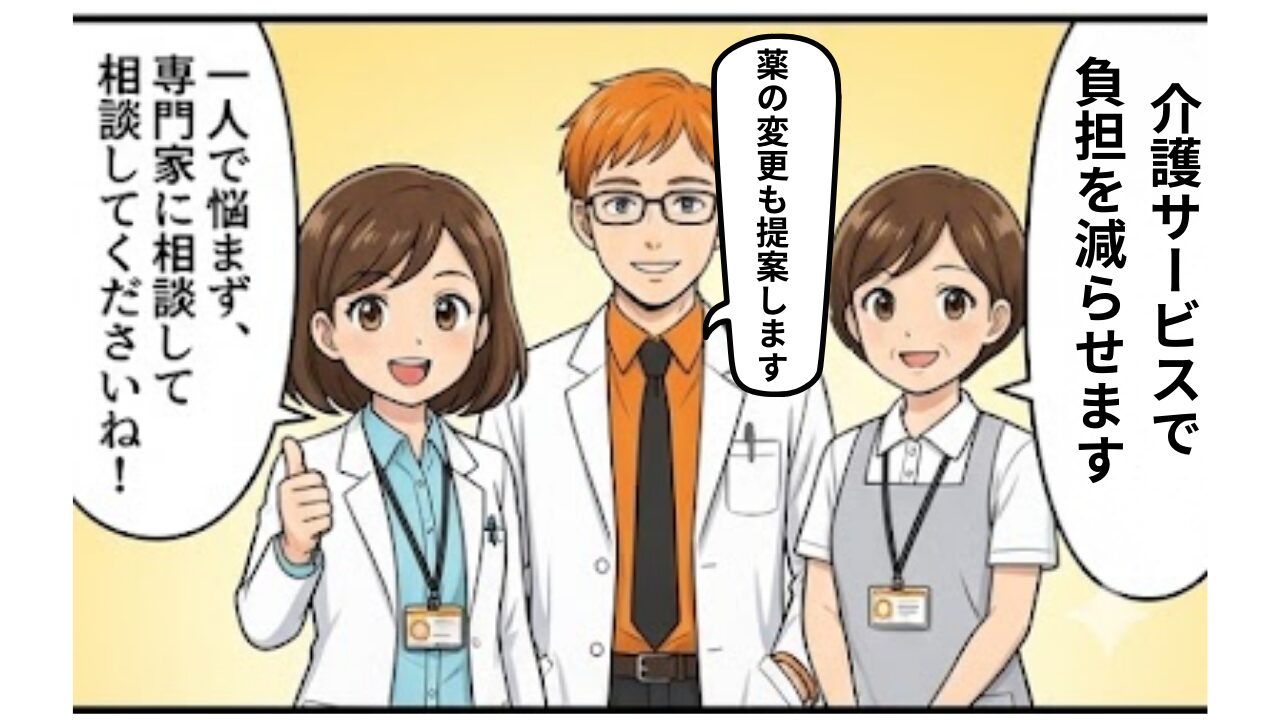 私たち薬剤師は、薬の調整を通じてBPSDのコントロールをお手伝いできます。ケアマネジャーは、介護サービスの利用を通じてご家族の休息を作ります。