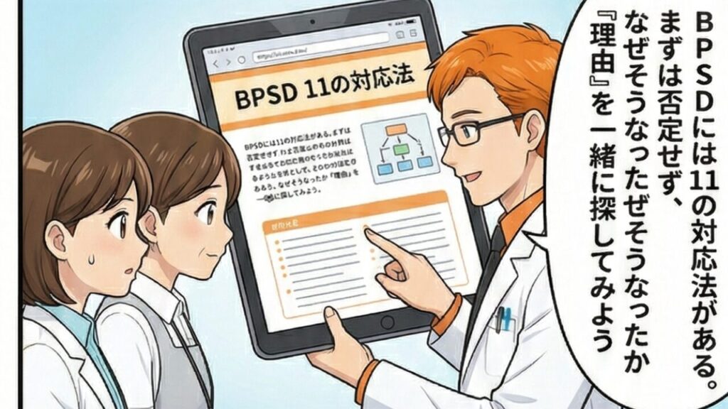 実に様々なBPSDがあり、環境や本人へのかかわり方、本人の元々の性格や合併している疾病によっても症状が出たり出なかったりするものだから、正解な対応は一律にあるとは言い切れません。対応してみないと分からないことも多いでしょう。