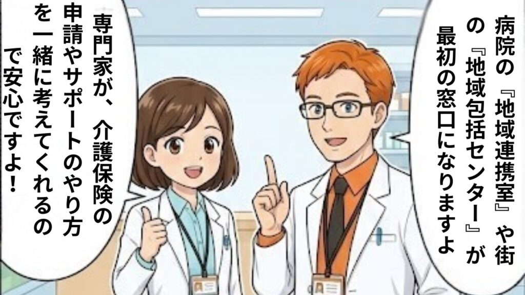 診断を受けた後、医師や看護師に「今後、家でどのように支援を受けたらいいか不安です」と伝えてみてください。そこから地域連携室へつないでもらい、お住まいの地域の地域包括支援センターやかかりつけ医、ケアマネジャー(介護支援専門員)へ橋渡ししてもらえることが多々あります。