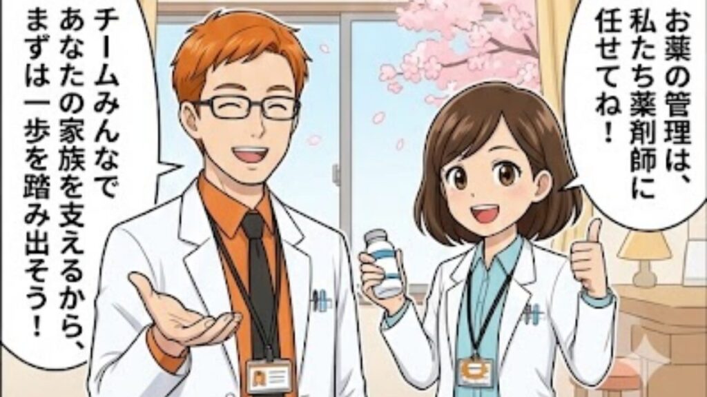 私たち薬剤師も、ケアマネジャーも、地域包括支援センターのスタッフも、みんなであなたとご家族を支えるチームです。決して一人ではありません。まずは、一本の電話から始めてみませんか?