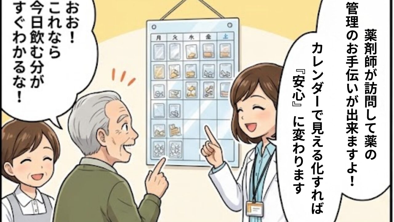 - 薬剤師(在宅訪問): 通院が困難な場合、薬剤師が自宅を訪問し、薬のセット、残薬の確認、副作用のチェックを行います。「お薬カレンダー」へのセットも依頼できます。