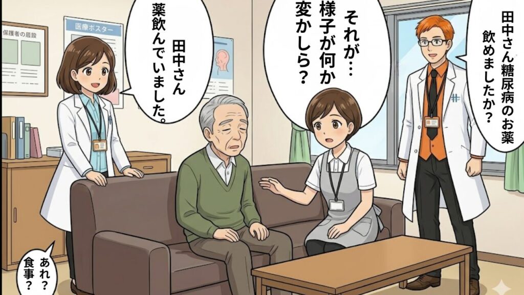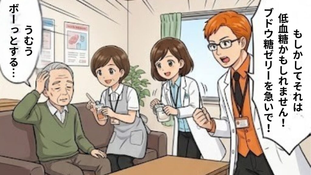 事例: デイサービスで田中さんが急に怒り出した事例。スタッフは「田中さん、また怒り出したわ」と思っていました。しかし、私の薬局でSU薬を飲んでいることを伝えると、スタッフは「低血糖かもしれない」と気づきました。ブドウ糖ゼリーを飲ませると、田中さんは落ち着きました。