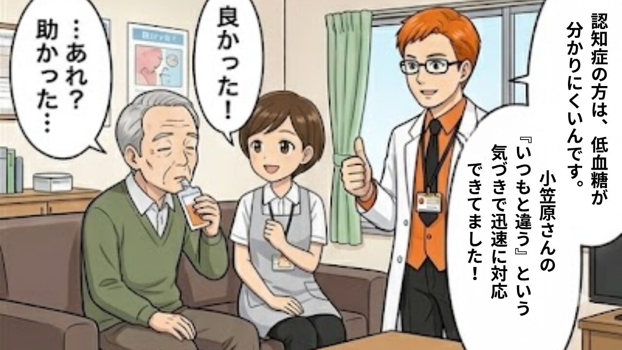 理由: 認知症患者の低血糖は見分けにくい。認知症患者も自らの違和感を言葉にできないから。いつもと様子が違うかどうか、介護者がアンテナを意識して張らないと低血糖を見つけられない。