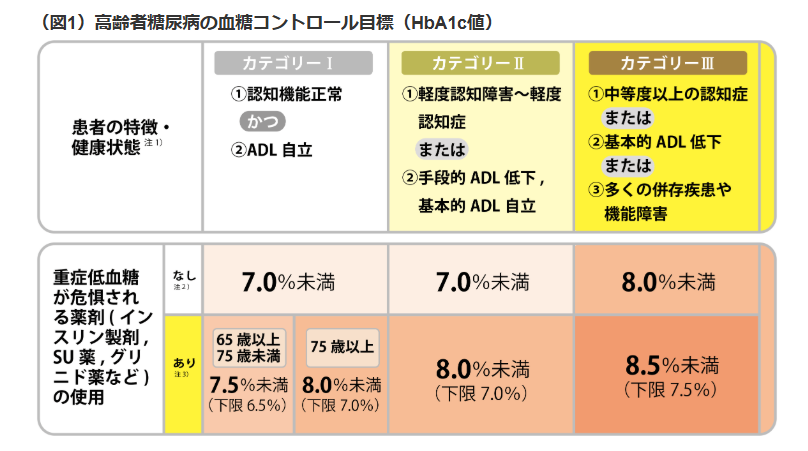結論: 治療目標値は患者ごとに異なる。認知症患者は低血糖を避けるためにあえて高めの設定。