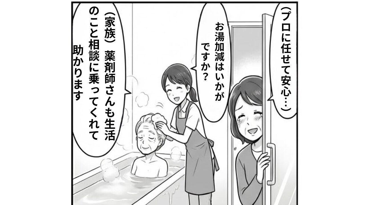 「浴室で転倒しそうになった経験から、怖くて一人では介助できなくなった。デイサービスの入浴を利用し始めて、安心して任せられるようになった」という声も。入浴は安全性の確保が最優先事項です。