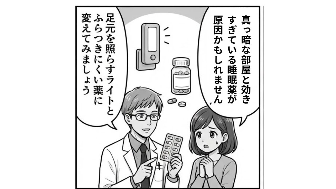 翌朝まで効果が残る(持ち越し効果)タイプの睡眠薬は、夜中のトイレ時の転倒リスクを高めます。超短時間型や、メラトニン受容体作動薬(ロゼレム等)、オレキシン受容体拮抗薬(ベルソムラ、デエビゴ等)など、筋弛緩作用が少なくふらつきにくい薬への変更を医師・薬剤師に相談してください。