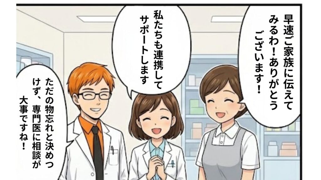 私たち薬剤師も、薬の効き方や副作用の出方から「もしかしたら違う病気かも?」と気づくことがあります。 ご家族だけで抱え込まず、ケアマネジャー、ヘルパー、訪問看護師、薬剤師など、関わっている専門職に「最近、後ろに倒れやすくて」「手が勝手に動くと言っていて」といった具体的な情報を共有してください。チームで支えることが大切です。